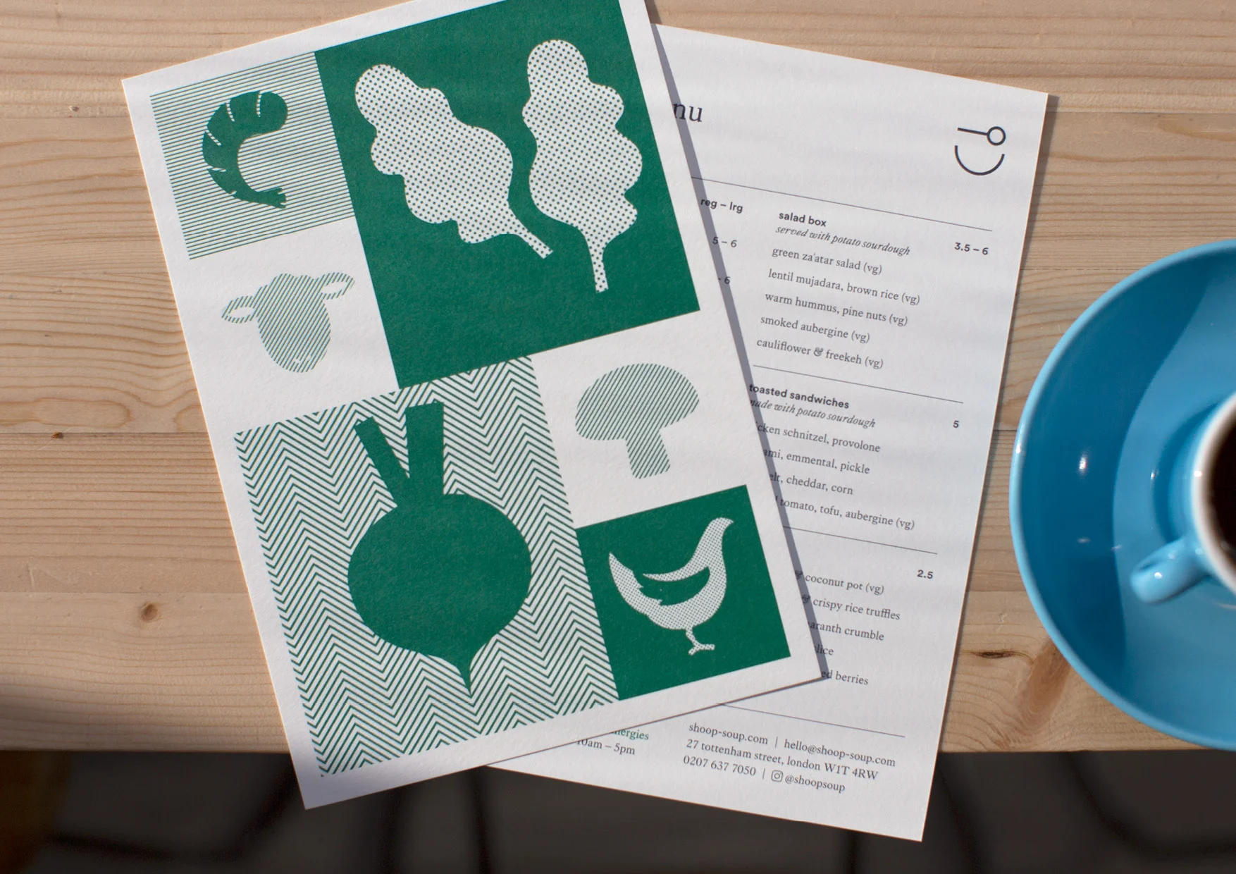 Shoop wanted an identity that felt as warm and friendly as a bowl of their signature dish – soup. Their mission is to serve a seasonally changing menu of soups, salads and sandwiches, all made fresh on site that day. To reflect their focus on ingredients, I created a palette of food icons to change with the menu.